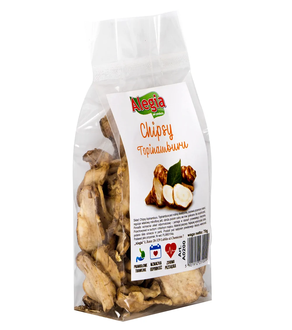 Alegia Topinambur Chips 70g to roślina która idealnie urozmaici dietę gryzoni i królików, ponadto dostarcza niezbędnych składników mineralnych i witamin. To w 100 % naturalny, zdrowy przysmak który dodatkowo obniża poziom cholesterolu, oraz glukozy we krwi. Zalecane są szczególnie w diecie koszatniczek które podatne są na cukrzyce, a także dla królików, szynszyli, kawii domowych, szczurków i chomików. Chipsy topinamburu bogate są w błonnik, regulują właściwą mikroflorę jelit oraz dodatkowo wspomagają odchudzanie.