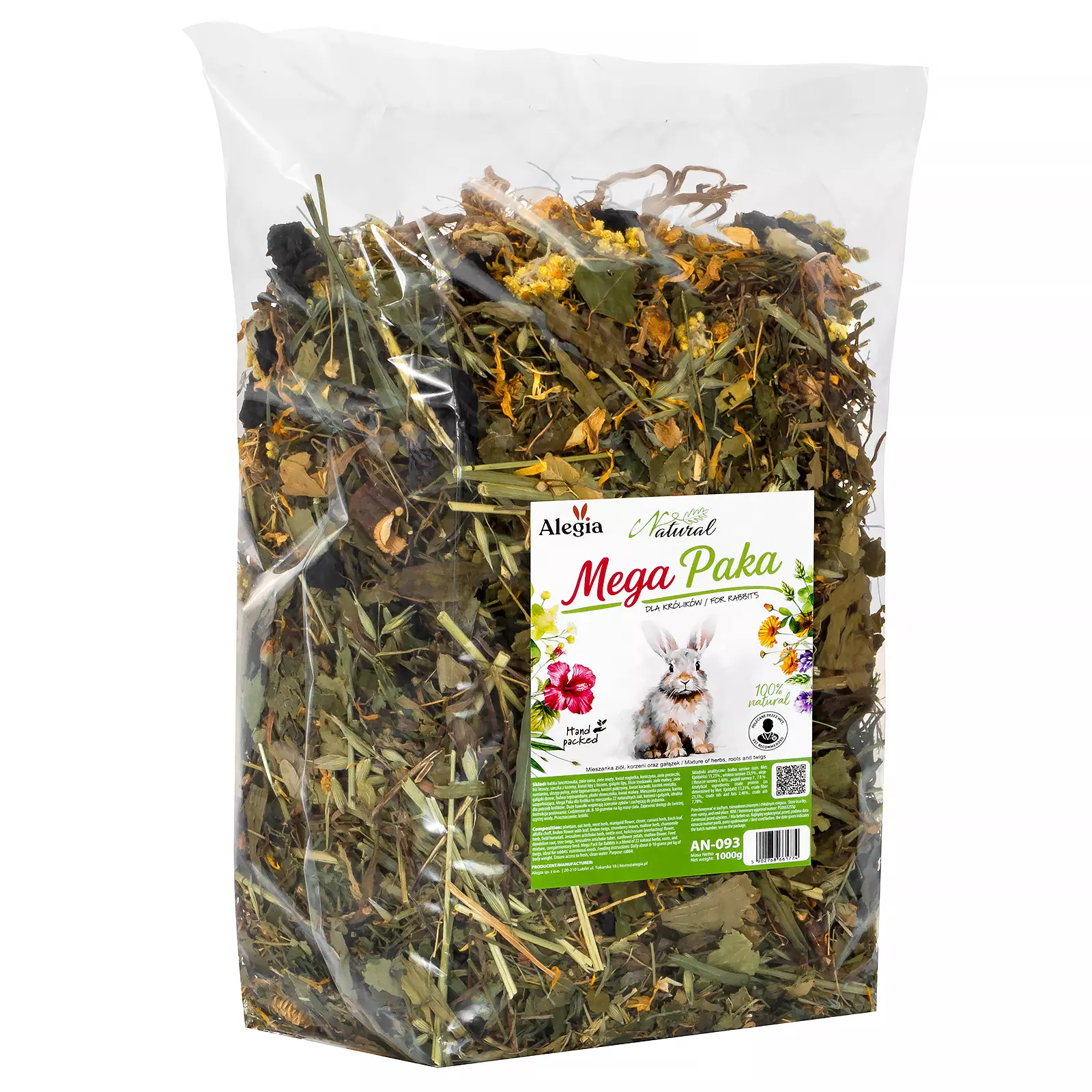 Naturalna Mega Paka od firmy Alegia to prawdziwa uczta ziołowa stworzona specjalnie z myślą o królikach. To aż 22 starannie dobrane składniki: zioła, kwiaty, korzenie i gałązki, które kompleksowo wspierają zdrowie, odporność, trawienie i naturalne potrzeby żywieniowe królików.