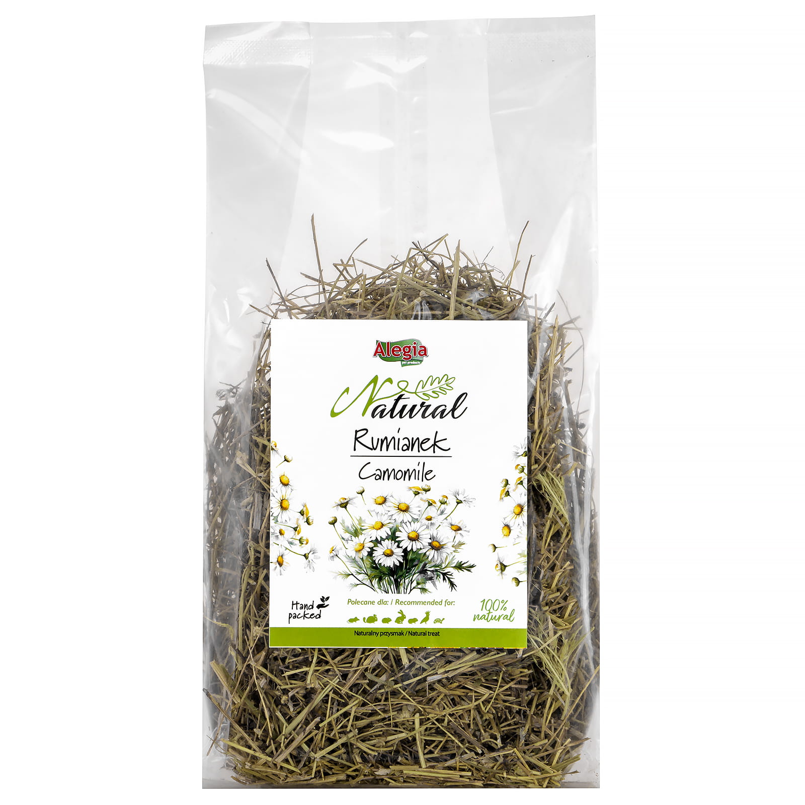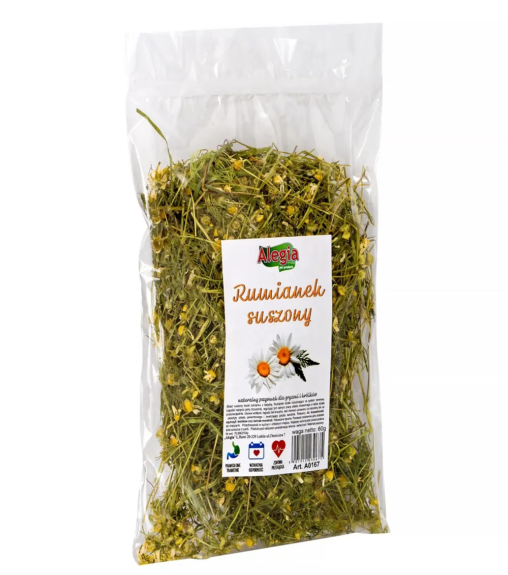 Rumianek 60g Alegia to idealna przekąska, która dzięki zawartości olejków eterycznych korzystnie wpływa na poprawę apetytu, przyspiesza trawienie oraz zwalcza dolegliwości związane z układem trawiennym. Można stosować również jako dodatek do ściółki.