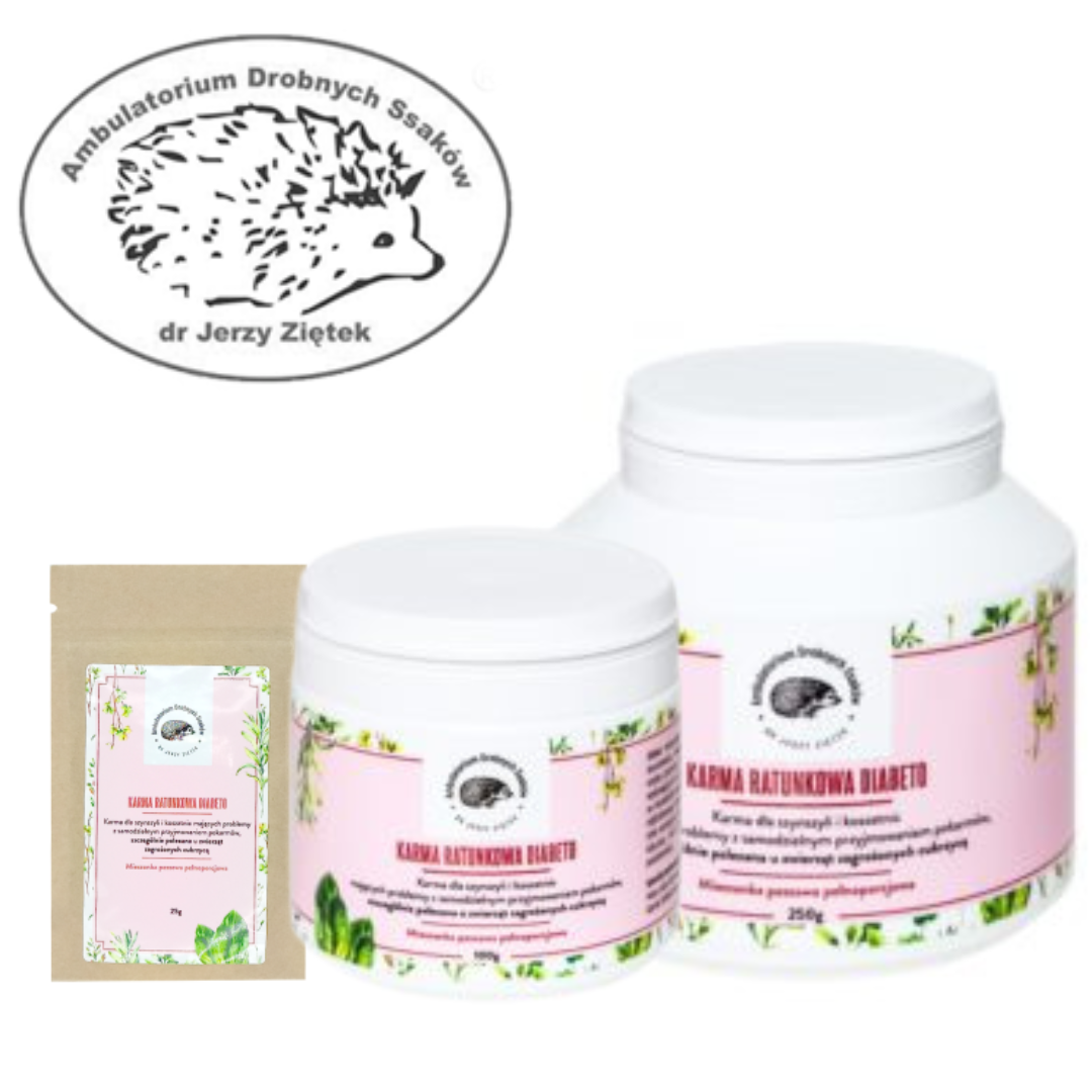 Wyzwania jakie stwarza codzienna praktyka lekarsko-weterynaryjna zaowocowały koncepcją dwóch karm ratunkowych specjalnych: karmy ratunkowej Plus+ oraz karmy ratunkowej Diabeto. Pierwsza jest przeznaczona dla zwierząt znajdujących się w szczególnie złej kondycji fizycznej, wykazujących dużą niedowagę, mających problem z przyjmowaniem większych porcji pokarmu. Wspomniana karma jest szczególnie bogata w łatwo przyswajalne składniki odżywcze, cechuje się zwiększoną kalorycznością oraz bardzo dużym rozdrobnieniem, przez co może być także podawana sondą żołądkową. Karma Ratunkowa Diabeto powstała z myślą o zwierzętach zagrożonych cukrzycą (koszatniczki, szynszyle) lub zwierzętach chorujących na tę jednostkę kliniczną. Specjalny skład uwzględnia obecność powoli przyswajanych węglowodanów, sporej ilości błonnika oraz dodatku roślin przyczyniających się do obniżenia poziomu glukozy we krwi. Obie karmy są dostępne w takich samych gramaturach, jak pozostałe nasze produkty tego typu: 250g, 100g i 25g.