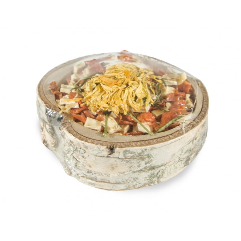 drewno brzozowe suszone, marchew suszona, pasternak suszony, łodyga pietruszki suszona, kwiat nagietka suszony, skrobia. Składniki analityczne: białko surowe (ozn. Met. Kjeldahla) min. 3,4%, tłuszcz surowy min. 0,1%, włókno surowe max. 6,35%, popiół surowy max. 6,28%, wilgotność max. 12%.