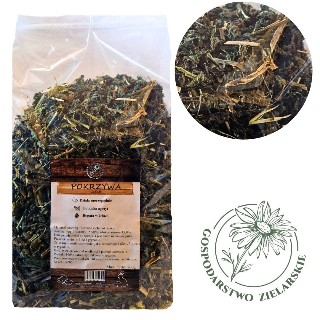 Pokrzywa wzmacnia organizm oraz oczyszcza go z toksyn. Korzystnie wpływa także na procesy przemiany materii. Reguluje działanie układu pokarmowego oraz poprawia perystaltykę jelit. Dodatkowo wykazuje się działaniem moczopędnym, regulując działanie układu moczowego. Dzięki dużej ilości żelaza wzmacnia odporność i zapobiega rozwojowi infekcji w organizmie. Zaleca się stosować w przypadku braku apetytu u gryzoni.