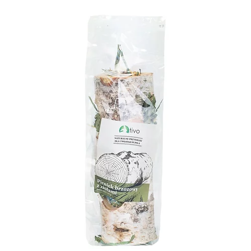Pieniek brzozowy z ziołami: babką lancetowatą i nagietkiem lub płatkami słonecznika – doskonały do ścierania ząbków i zabicia nudy. Pieniek jest wielokrotnego użytku, można go napychać siankiem, ziołami lub ulubionymi przysmakami.