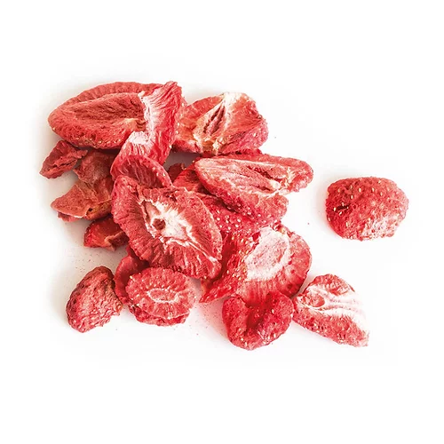 Truskawka liofilizowana. Bez cukru, bez konserwantów, bez sztucznych barwników. Naturalny smak, aromat i kolor.