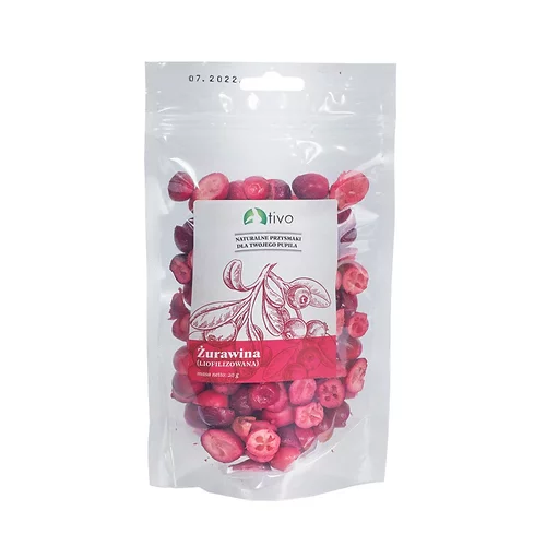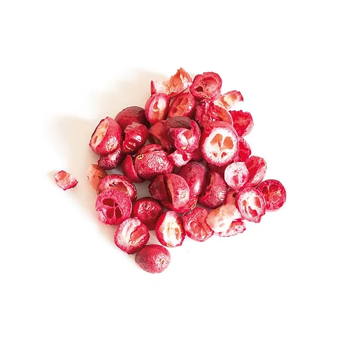 Żurawina liofilizowana. Bez cukru, bez konserwantów, bez sztucznych barwników. Naturalny smak, aromat i kolor.