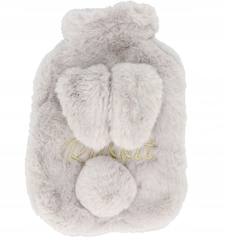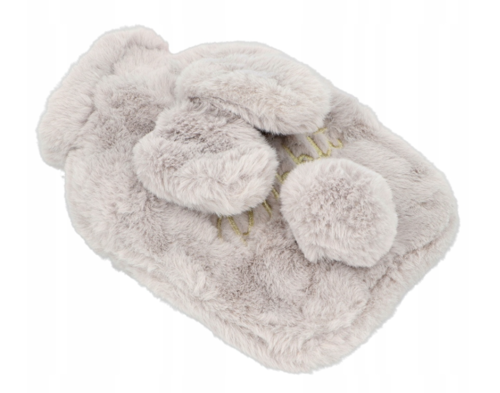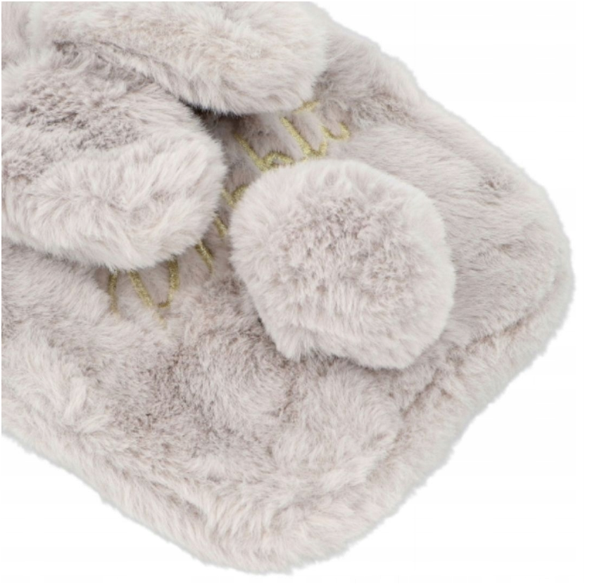 Szary termofor w pokrowcu, z włochatym futerkiem, uszkami oraz ogonkiem, jest przyjemny w dotyku i idealnie nadaje się do przytulania. Sprawdzi się podczas zimnych wieczorów i dni.