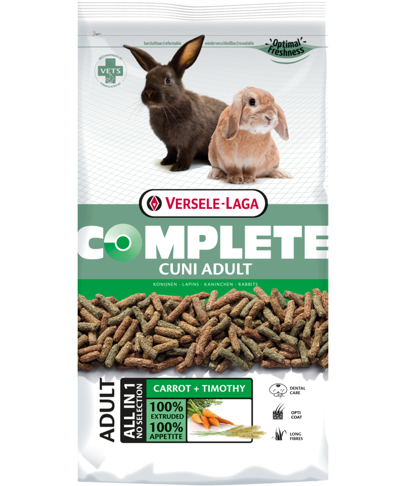 Versele-Laga Complete Cuni Adult to żywienie bez zmartwień. Niezwykle smaczne ekstrudaty przygotowane wg koncepcji "wszystko w jednym" zapobiegają selektywnemu pobieraniu pokarmu. Dzięki temu Twój królik otrzymuje wszystkie niezbędne substancje odżywcze pozwalając mu cieszyć się pełnią zdrowia. Wysokobłonnikowy, zawierający długie włókna pokarm jest specjalnie dostosowany do potrzeb żywieniowych dorosłych królików. Versele-Laga Complete Cuni Adult został przygotowany przez lekarzy weterynarii w oparciu o zaawansowane badania.
